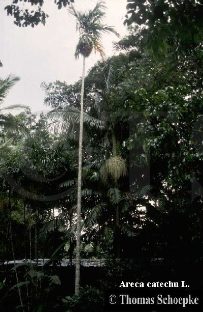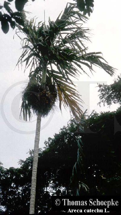 Familienmerkmale: 187 Gattungen mit 2000 Arten; Bäume oder Sträucher, daneben wenige Lianen, mit häufig kräftigen und verholzten Stämmen (ohne sekundäres Dickenwachstum, dafür mit starkem primären Dickenwachstum) mit nahezu identischem Durchmesser vom Grund bis zum Gipfel, wo dann ein mehr oder weniger dichter Blattschopf entspringt (s. Foto von Phoenix canariensis); Mesophyten oder Xerophyten; Blätter immergrün und ledrig, gestielt, wechselständig, spiralig oder zweizeilig angeordnet, Blattspreite fast immer (finger- oder handförmig) geteilt; Pflanzen monözisch, diözisch oder polygamomonözisch, selten zwittrig, anemophil oder entemophil; Blüten klein, 3zählig, in meist achselständigen, überwiegend komplex zusammengesetzten Rispen; Perianth doppelt oder mit gleich gestalteten, kronblatt- oder kelchblattartigen Tepalen, selten rudimentär bis fehlend, meist 3+3, seltener 2+2 Tepalen, frei oder verwachsen, A3, 6, 9 oder 10-900, frei oder adnat, nur mit fertilen Staubblättern, Vorkommen von Staminodien fraglich, G3(-10), apokarp oder synkarp, Fruchtknoten oberständig; meist 1samige, überwiegend (trockene) Beeren oder Steinfrüchte; chemisch charakterisiert durch das verbreitete Vorkommen von Polyphenolen einschließlich Gerbstoffen und Silikaten, Ca-Oxalat in Raphidenzellen, häufig durch einen sehr hohen Anteil gesättigter Fettsäuren gekennzeichneter fetter Öle in den Samen; Subtropen bis Tropen: weltweit verbreitet in den Tropen und Subtropen. Taxonomische Einordnung: Monocotyledonae / Überordnung Areciflorae / Ordnung Arecales, APG - Unterklasse Liliidae / Commelinoiden / Ordnung Arecales. Arzneipflanzen: Areca catechu L. (Arecae semen - Betelnüsse), Cocos nucifera L. (Cocos oleum - Kokosfett), Copernicia prunifera (MILL.) H. E. MOORE (Cera carnaubae - Carnaubawachs), Elaeis guineensis JACQ. (Palmae oleum - Palmfett), Serenoa repens (W. BARTRAM) SMALL / Sägepalme (Sägepalmfrüchte - Sabal serrulatae fructus). Nutzpflanzen: s. Arzneipflanzen, ferner zahlreiche Arten von großer wirtschaftlicher Bedeutung wie z. B. Metroxylon sagu ROTTB. (Sago), Orbignya speciosa (MART.) BARB. RODR. (Babassuöl), Phoenix dactylifera L. (Datteln). Quellen und weitere Informationen: biodiversity.uno.edu/delta*, Stevens, P.F. (2001 onwards). Angiosperm Phylogeny Website*. |