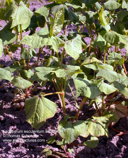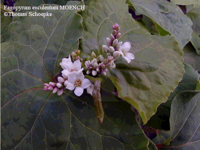 Botanische Beschreibung der Stammpflanze: Einjährige, 20 bis 80 cm hohe, von Juni bis September blühende Pflanze mit spindelförmiger Wurzel. Der hohle, runde Stengel ist aufrecht, wenig ästig, oft rot überlaufen und ausgesprochen saftig. Die wechselständig angeordneten Laubblätter sind herzpfeilförmig zugespitzt, so lang oder länger als breit und im Umriss fast fünfeckig. Die Blattlappen sind stumpf oder abgerundet und am Rande weit ausgeschweift. Die unteren Blätter sind lang gestielt, die obersten fast sitzend. Die für Knöterichgewächse typische Ochrea ist nur sehr kurz, schief gestutzt und kahl. Die Blüten sind zu vielen in dichtblütigen, kurzen Scheintrauben angeordnet, die wiederum an den Sprossspitzen mehr oder weniger schirmrispig zusammengefügt sind. Die Blütenhülle besteht aus fünf 3 bis 4 mm langen, weiß bis rosa gefärbten, ungeflügelten Perigonblättern. Die acht Staubblätter besitzen am Grunde goldgelbe Nektarien, die 5 bis 6 mm langen, 3 bis 4 mm breiten, zuerst glänzenden, später matten, kastanienbraunen Nussfrüchte ganzrandige, scharfe Kanten. Die reifen Früchte sind mindestens doppelt so lang wie die Blütenhülle. |